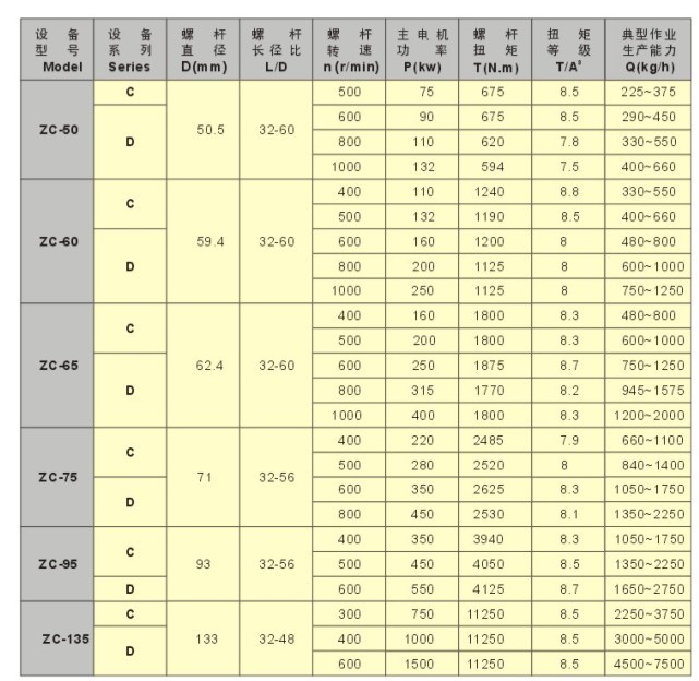 ZC-C、D系列雙螺桿擠出機組主要技術(shù)參數(shù)