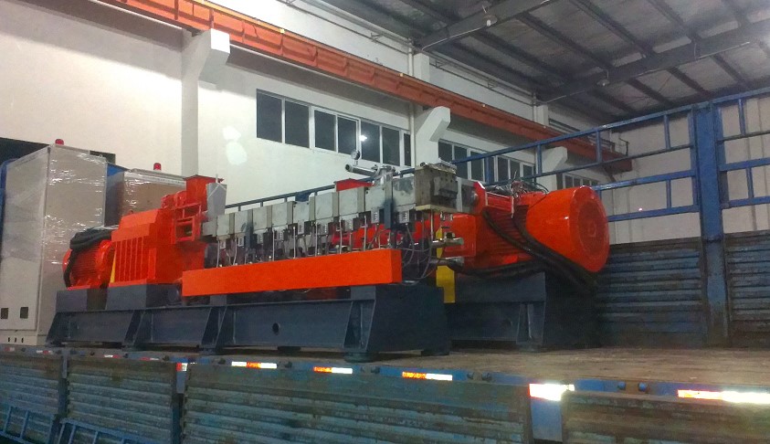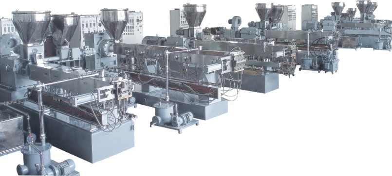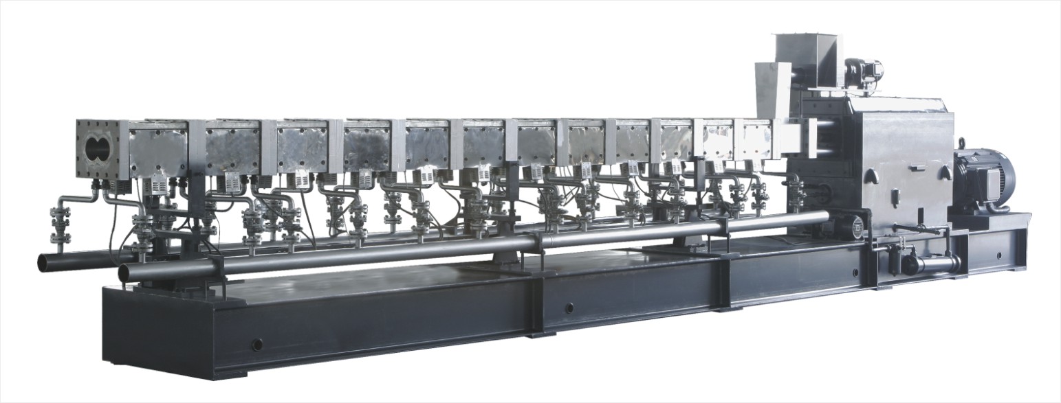 ZC系列雙螺桿擠出機由驅(qū)動部分與加工部分組成。驅(qū)動部分包括傳動箱與電機。根據(jù)機型特點,交流電機及直流電機可供選擇。傳動箱采用平行三軸式結(jié)構(gòu),具有液位計低油位報警、過濾阻塞超壓報警的功能。加工部分由兩根同向旋轉(zhuǎn)的螺桿芯軸、螺桿元件、筒體組成。筒體有閉合筒體、喂料筒體、排氣筒體。螺桿長徑比可根據(jù)加工工藝調(diào)整,螺桿元件隨加工物料性能組合可實現(xiàn)物料輸送、混合、塑化、剪切和脫揮。粒料、粉料、液體料可分別通過主料斗、側(cè)喂料斗或液體計量裝置加入,也可采用失重式多路喂料計量系統(tǒng)。